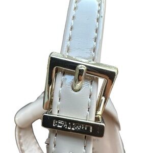 - Adjustable strap buckle closure. Buckle is in a light gold colour.