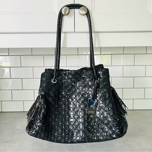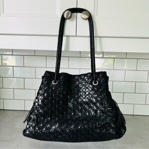 Very good condition, some minor signs of wear on the leather and hardware. Genuine leather. Made in India. Drawstring style with snap closures.