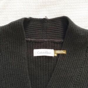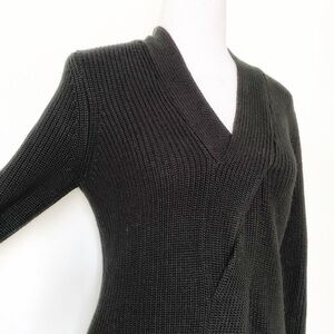CALVIN KLEIN BLACK V-NECK FRONT CABLE KNITTED LONG SLEEVE MIDI DRESS, a minimalist, classy, classic, conservative, timeless yet contemporary black knitted long sleeve midi dress from designer Calvin Klein featuring a v-neckline and a cable knitted detail on the front / torsado knit design creating a flattering vertical line for the silhouette. Unlined - pull over style - cozy - comfy - perfect for work as much as holidy's seasons cozy family dinner or a first date. Fall and winter favorite with pumps or high boots.