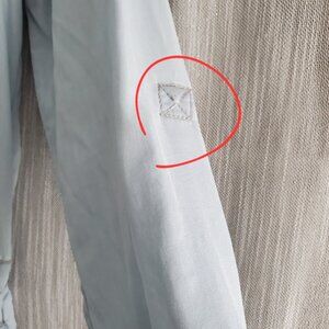 Easy wear front zip up, drawstring waist, & rollup sleeves (READ: button is missing on one of the sleeves for rollup, see circled pic)