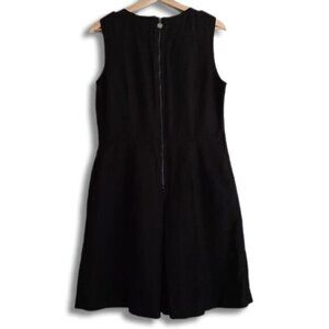 • Sleeveless scoop neck knee length dress in black with defined waist. Back concealed zipper closure.