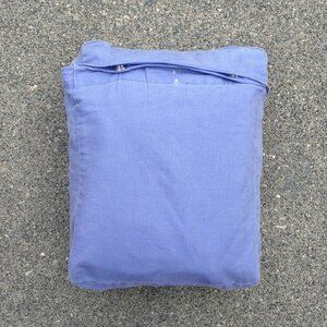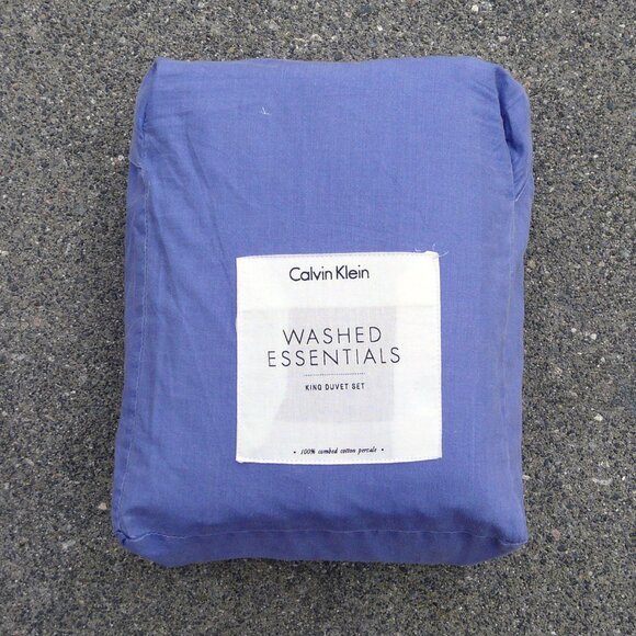 Calvin Klein Washed Essentials duvet set. Size in king and includes a duvet cover with button closure and two pillow cases, envelope style. 100% combed cotton percale, made in India. Colour is amethyst or a medium violet.