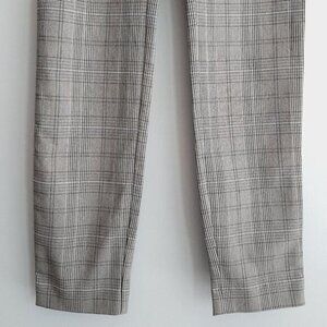 • Stretchy pull on dress pants style crop ankle legging in grey and cream glen check plaid pattern.