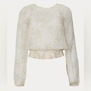 For an elegant addition to your warm-weather wardrobe, look no further than the 'Robyn' top from Cami NYC. Constructed from silk chiffon In ivory with pale yellow florals, it has a relaxed silhouette and a smocked hem with a jersey inner cami to temper the sheer bodice.