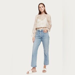 For an elegant addition to your warm-weather wardrobe, look no further than the 'Robyn' top from Cami NYC. Constructed from silk chiffon In ivory with pale yellow florals, it has a relaxed silhouette and a smocked hem with a jersey inner cami to temper the sheer bodice.
