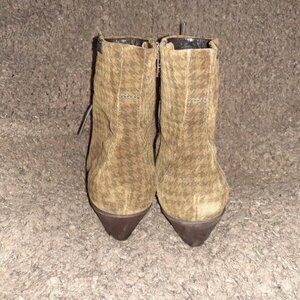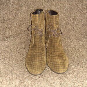 Rare pair of suede booties in a brown/black houndstooth pattern.