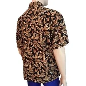 Stylish, not to mention, handsome, short-sleeve button up front Hawaiian shirt with a gold leaf pattern. Perfect for casual outings, vacationing in warm climates, or for casual days at the office.