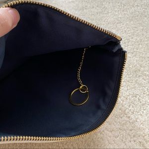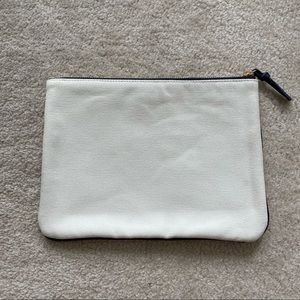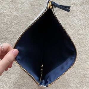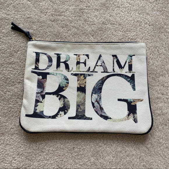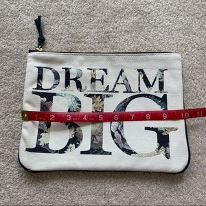 hi! selling this brand new canvas clutch! in a cream canvas material with navy blue accents and piping, with a golden coloured zipper. the text says “DREAM BIG” in a dark bold font with floral peeking through. inside is lined with a navy blue fabric with a gold link chain with jump ring to attach possibly keys! or anything for easy access.