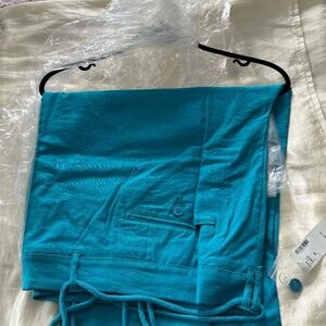 CAPRI, STRETCH LINEN, CARAIBE BLUE, SIZE 24, 53% LINEN 45% VISCOSE 2% SPANDEX, BUTTON FLY, DRAWSTRING, ADDITION ELLE, TAGS ON, NEW NEVER WORN