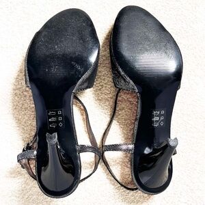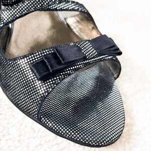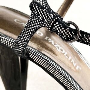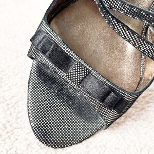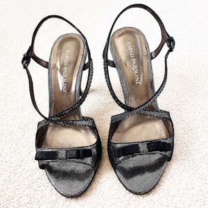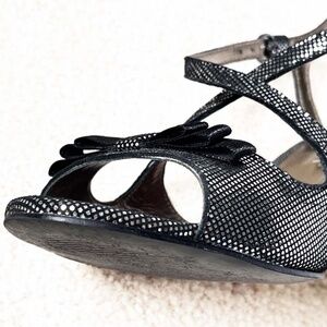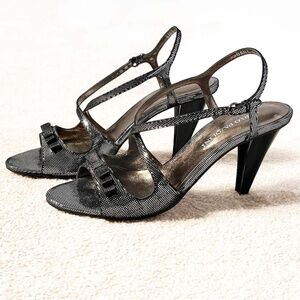 CARLO PAZOLINI Black Satin Bow Sparkle Sandals. Gorgeous sparkle sandals styled with feminine charm. Features a dainty black satin bow embellished toe, slim criss-cross straps, luxe sparkle dot design, light metallic bronze lining, shiny black heels, buckle-fastening ankle strap and logo marked details. Elevates your chic glamorous style for your party-ready look!