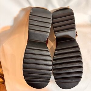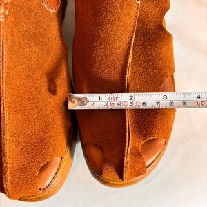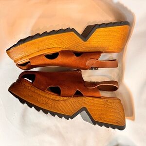 CARLO PERA Sz 9 Brown Suede Platform Sandals 70s Vibes Buckle Closure. Stylish brown suede platform sandals with a unique cut-out design. Perfect for casual outings. Bohemian. Hippie.