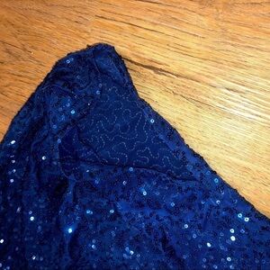 Excellent condition Designer Caroline Rose Dark Blue Sequinned Tunic Style draping top, short sleeves with arm holes (close up photos) OSW - laying flat the garment measures 40” across - however when worn it drapes and gathers in a flowy and flattering manner. Sparkly blue sequins.