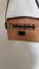 Carpel small crossbody bag is tan coloured cork with a zipper top. Zipper pocket on front of bag. Dark brown trim and strap. No interior tags or material tag. Interior is dark brown fabric with an open pocket.