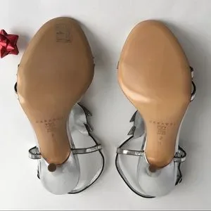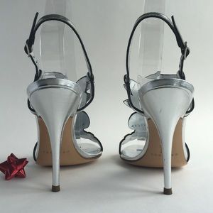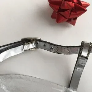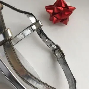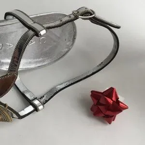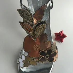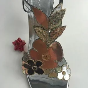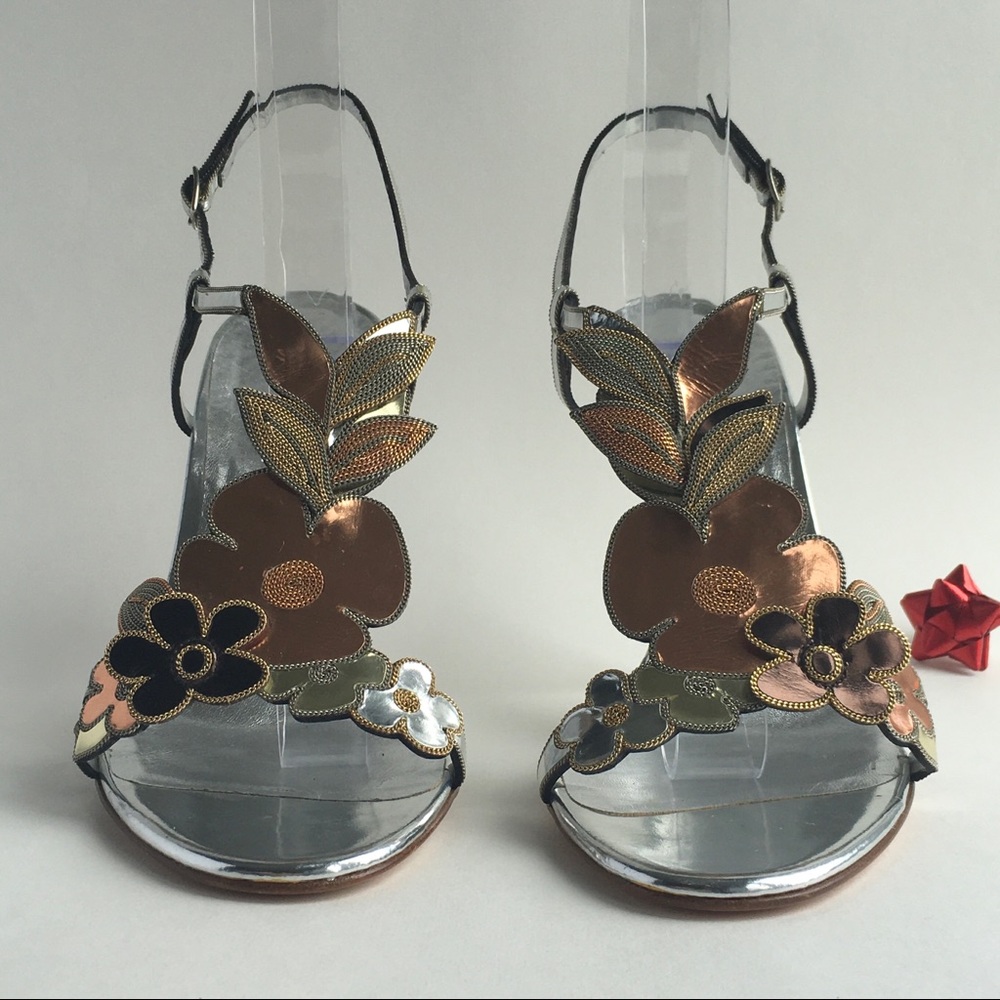 -New never worn but with some defects: some cracking and scratches to metallic leather from age, scuffs/marks on heels