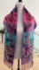 Cashmink reversible long winter scarf with fringe. 100% acrylic. Made in Germany. One side has darker colours in purple with blue and pink accents. The other side has bands of colour in pink, blue and purple. Both sides have a rose floral pattern.