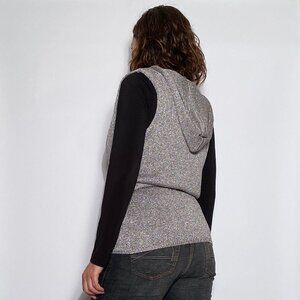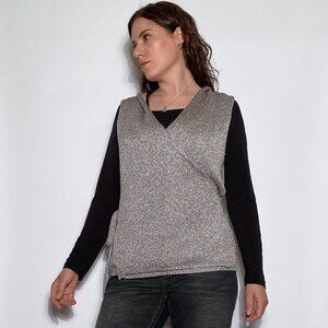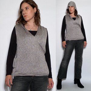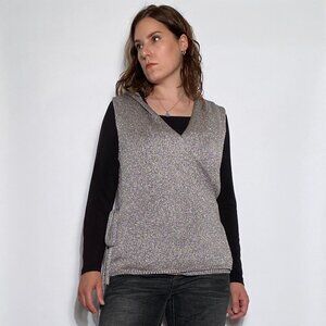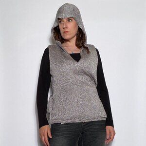 Chunky metallic knit wrap sweater vest with hood. Has a more open weave that gives it a chain mail look and the hood dips down in the front giving it a knight's helmet vibe, would make an amazing piece for a Joan of Arc costume. Tags says large but as it's a wrap and can be made bigger or smaller it's basically one size.
