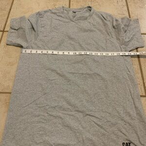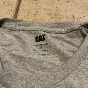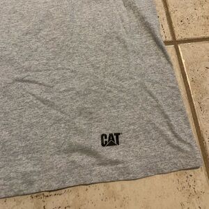 Show your love for heavy machinery with this classic gray CAT (Caterpillar) t-shirt. This comfortable and versatile tee features a small CAT logo on the chest and a larger logo at the bottom hem. It's perfect for casual wear, work, or adding a touch of rugged style to your wardrobe.
