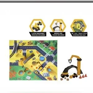 The Little Machines Construction Mat includes a working crane, bridge, construction cones, boulders and two Little Machines vehicles for endless fun.