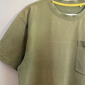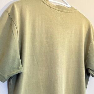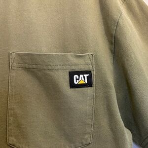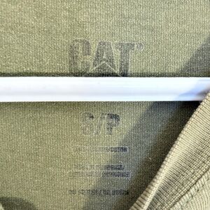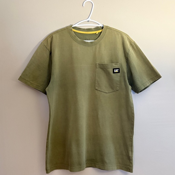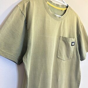 Get ready for work with the Caterpillar Olive Green Cotton T-Shirt! This durable workwear features a convenient pocket and iconic Caterpillar logo, perfect for any job site. **please note there is a little sun bleaching & small hole as shown in photo
