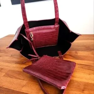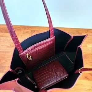 Gently used ela handbags 🇨🇦 catch all tote in burgundy croc effect. Some signs of wear on the seams of base, refer to photos.