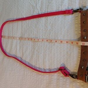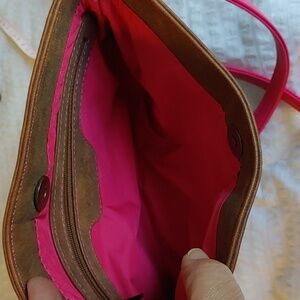 - magnetic snap closure, inside of bag has one zip compartment, hot pink lining same as strap and is in great condition