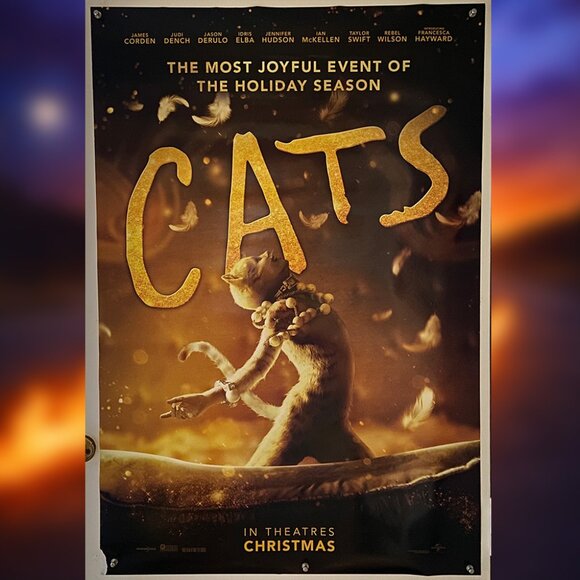 A bold, eye-catching advance one-sheet for the big-screen adaptation of the iconic musical, this is an authentic, original theatrical movie poster for Cats (2019). Featuring the shimmering gold title over a dramatic feline pose and floating feathers, this design is topped with the line “The Most Joyful Event of the Holiday Season” and lists the all-star cast including James Corden, Judi Dench, Idris Elba, Jennifer Hudson, Ian McKellen, Taylor Swift, and Rebel Wilson. This is an advance poster (teasing the release with “In Theatres Christmas”) and it’s double-sided for theatre lightbox display—not a reproduction—perfect for musical fans and modern movie-poster collectors.