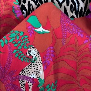Bold tote with vibrant animal and floral patterns. Features a unique design with a mix of colors. Ideal for adding flair to any outfit.