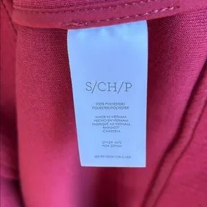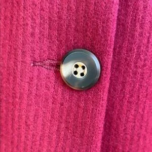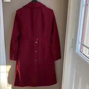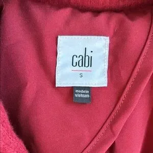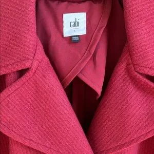 Elegant CAbi trench coat in deep red. Features button-up front and classic collar. Perfect for a sophisticated look.