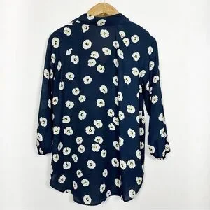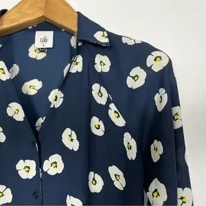This CAbi blouse features a relaxed fit with a notched collar, crafted from a navy blue fabric adorned with white daisies.