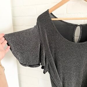 Add shimmer and shine to your next event with this shimmering overlay jumpsuit, featuring delicate flutter sleeves.