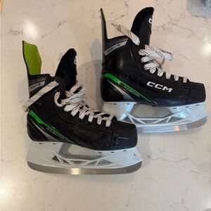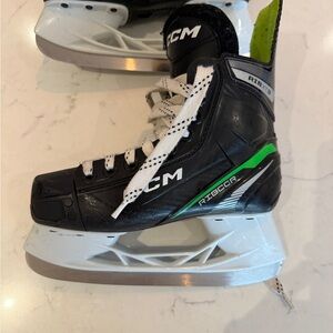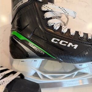 CCM Ribcor skates with black and green accents. Designed for performance on ice.