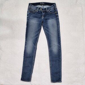 Silver Brand *Tuesday* Jeans in light blue denim with vintage fade. Size 26/31. Low rise/skinny Jeans. Has lovely preloved wear. Have a couple small tears, see pictures please. Cotton/poly/viscousse/Elastine. 7 inch rise, 38 inches outseam, and 30 1/4 inch inseam aprox. Good overall vintage preloved condition.