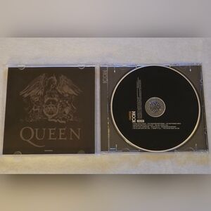 Classic Queen CD with sepia-toned band photo and bold QUEEN logo. Features iconic track listing printed on front. Great for collectors and fans.