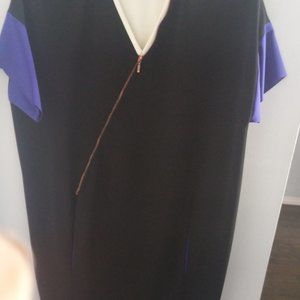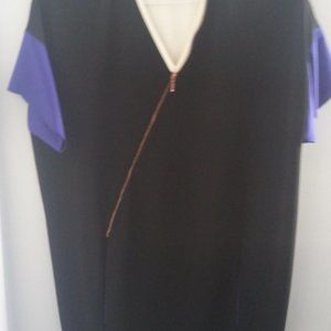 I'm a size 12 so this fit me like a cocoon dress. Purchased from Moda Operandi. Easy to style with leggings and rose gold jewelry. Colorblock mainly black with cream trim and purple sleeves.