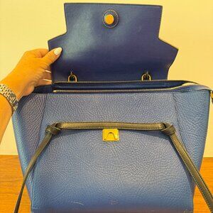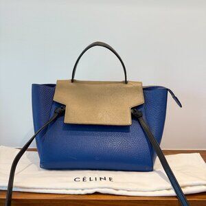 This is an authentic CELINE Smooth Calfskin Mini Tri-Color Belt Bag Royal Blue. Tte bag is crafted of smooth calfskin leather witha taupe flap and a black leather handle. The bag features a back zipper closure and comes with a leather shoulder strap.