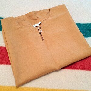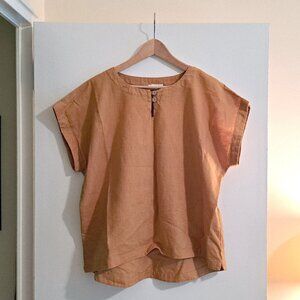 This mid-weight loose-fitting top features short, grown-on sleeves and a curved, dropped hem. The yellow orange goldenrod is a wonderful, summery colour, woven from yarn-dyed linen. A crew neckline is complimented with a keyhole detail, two coconut buttons and loop fastenings. In like-new condition. Measures 24 inches pit to pit, 26 inches total length.