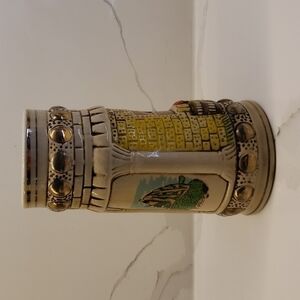 #708 Ceramica Saq Joaquim beer stein 'Welcome to Rio' on handle Rincao Gaucho Gold circles top bottom rim and handle 7"h x 3" diam.