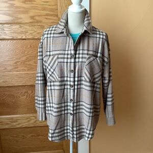 Chic plaid shirt jacket by C'est Moi. Features button closure and large chest pockets. Ideal for layering.