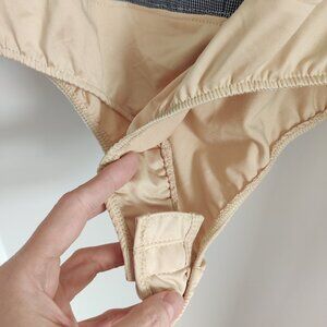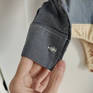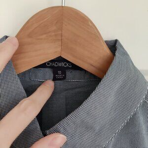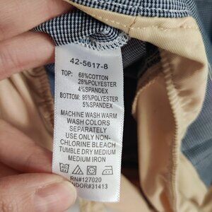 From Chadwicks, this is a cotton blend dark blue check button down bodysuit in size 10. Bikini style bottom with two levels of adjustable snaps.
