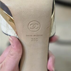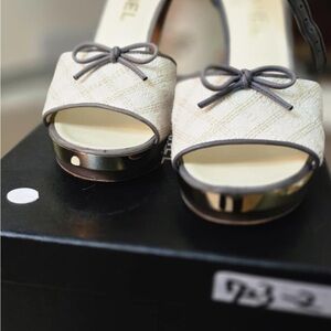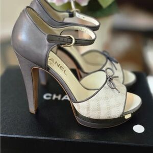 Elegant CHANEL sandals. Black leather straps. Cream woven texture. Bow detail on the front. High heel design.