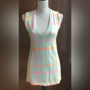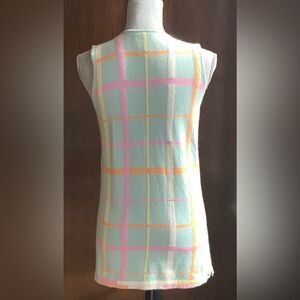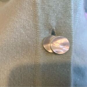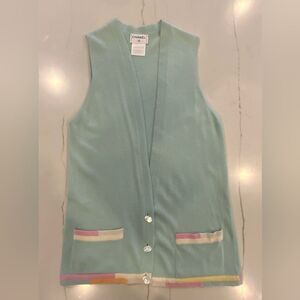 Chanel mint green, pastel sleeveless sweater set is 100% cashmere. Preloved by me, this is from 1999 Spring/Summer Collection. Tag size is 40 but please view measurements in inches. There is a little snag that I repaired on the back of the vest. Please view photo. These pieces can be worn together or separately to achieve various looks. THE ASKING PRICE INCLUDES THE CHANEL HANGER AS WELL.