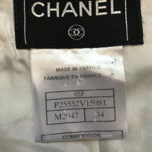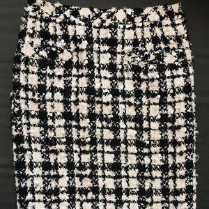 Gorgeous. Gently used. Like new! 2 faux pockets in front with cute Chanel logo embellishment on the left pocket. Black & white tweed skirt with sequins. Classic - will never go out of style! Size 34