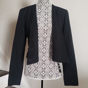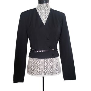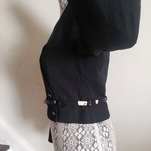 Belt at waist with 3 cc logo embossed on it . Silk lined. Medium padded at shoulder 3 front buttons closure with embedded cc logo. Hook and pressed closure at chest. pressed closure at hem. Great preowned condition, in black. Size tag removed but I'm guessing small. Please refer to measurements for proper fit. measurements laying flat; pit to pit 18" waist 15" shoulder to hem 18" Sleeve 24" shoulder to shoulder 15"