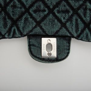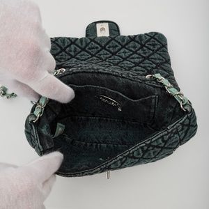 This flap bag is made of diamond quilted denimpression. The bag features a silver chain interlaced with leather shoulder strap, Chanel logo turn lock on the front flap and an interior with denim fabric with a patch pockets. The color is blue with a washed distressed look. Chanel style #: AS1309