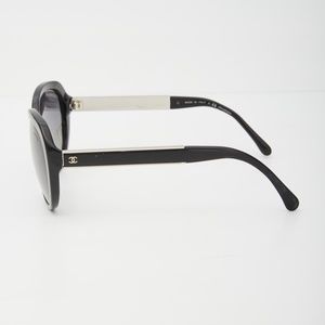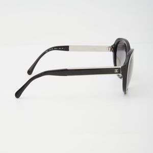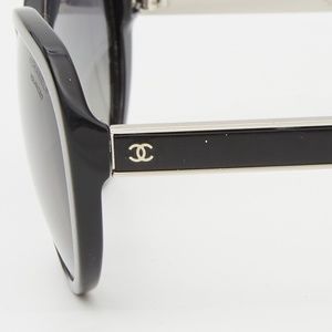 The Chanel sunglasses by Karl Lagerfeld are made of black Acetate and feature a car-eye shape, an interlocking CC logo on the side and tinted lenses.