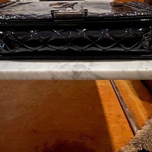 This stunning bag is crafted from navy blue patent leather and exhibits the timeless quilt on the sides and the edges. The bag features a thick aged ruthenium silver chain shoulder strap with a patent leather shoulder pad, and an aged ruthenium Mademoiselle press lock. This opens the front flap to a fabric interior with zipper and patch pockets.