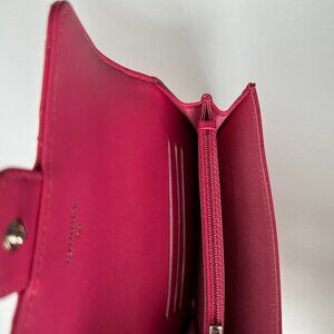 Chanel quilted patent leather zip wallet. Features fuchsia pink patent leather and silver tone hardware. Includes one back pocket, one zip compartment and card slots.