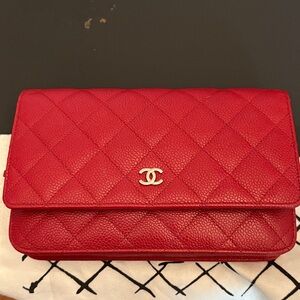 Authentic Red Quilted Caviar Leather Classic Wallet on Chain w/ Authenticity Card.