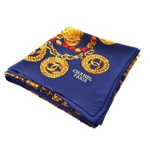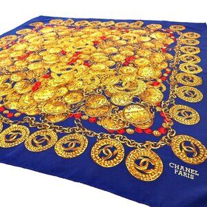 CHANEL Silk Scarf CC Medallion Coins Chains Gold Blue Vintage