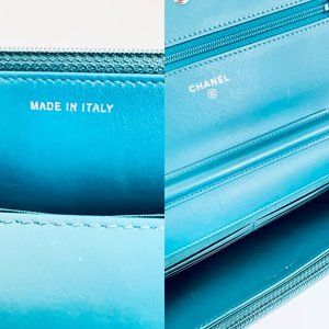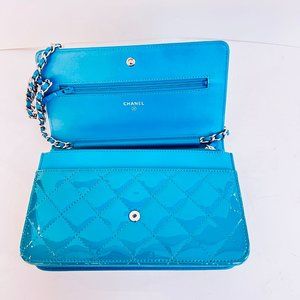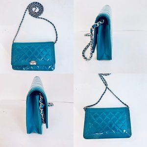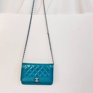 CHANEL Turquoise Blue Patent Calfskin Quilted Boy Wallet On Chain WOC